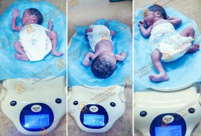 由于早產,三個寶寶都非常小,最重的老二才1.85千克,老大也不過1.75千克,最小的老三僅有1.18千克,真的是只有巴掌大。幸運的是由于提前采取了促肺成熟的措施,三個小寶寶剛出生時的哭聲都還比較響亮。