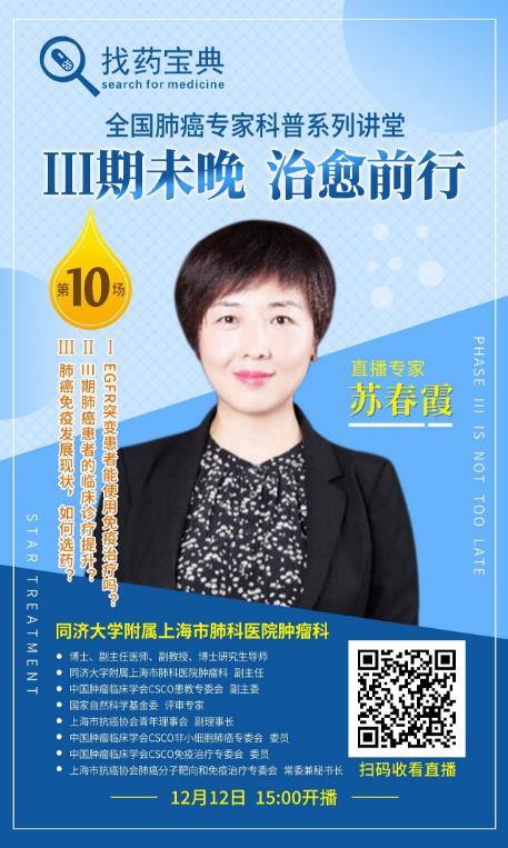 上海市肺科醫(yī)院腫瘤科 副主任醫(yī)師 蘇春霞線上直播:三期肺癌免疫治療如何選藥