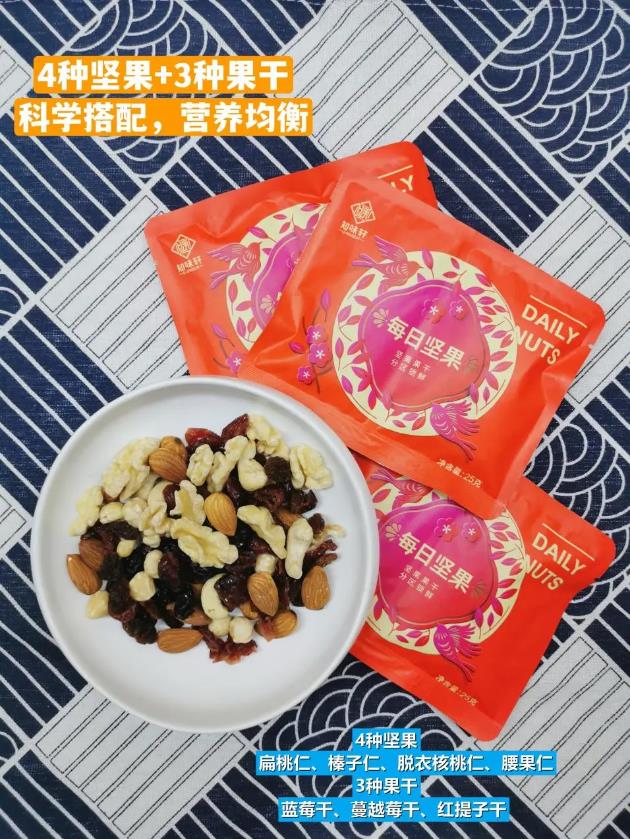 知味軒每日?qǐng)?jiān)果(悅享裝)“匯聚”了扁桃仁、榛子仁、脫衣核桃仁、腰果仁、藍(lán)莓干、蔓越莓干、紅提子干,共7種來(lái)自全球的高品質(zhì)堅(jiān)果和果干,每一顆堅(jiān)果又大又飽滿,吃起來(lái)酥脆可口,根本停不下來(lái),真的很過(guò)癮……妥妥的追劇熱門(mén)小零食了~