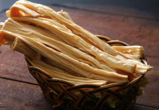 另外,真腐竹呈淡黃色,有一定光澤,透光可見纖維狀結(jié)構(gòu)。假腐竹是一白一黃一黑的。并且看不到纖維組織。用溫水泡過的腐竹輕輕一拉就有一定的彈性,而假腐竹沒有彈性。