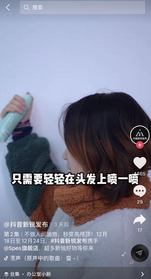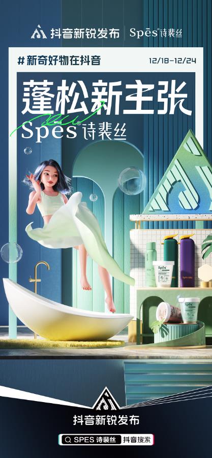 除鞠婧祎外,“抖音新銳發布”為Spes聯動了站內站外多方資源,多頻次、多維度推廣產品,不斷觸達、激發用戶消費興趣。在活動開始前,“抖音新銳發布”官方賬號就發布了預熱短視頻。該視頻圍繞職場新人保持良好個人形象的辦公場景展開,生動呈現了Spes致力于為用戶提供更有效更美好洗護體驗的品牌主張。
