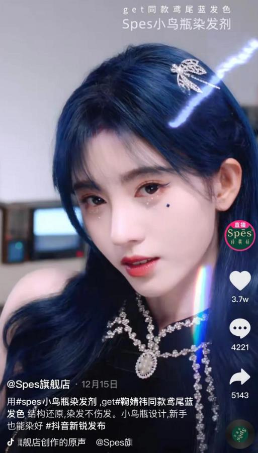 本次“抖音新銳發布”活動中,Spes精準借勢品牌代言人鞠婧祎的形象感染力,首次推出其使用Spes小鳥瓶染發劑后的廣告短片。視頻中,鞠婧祎的鳶尾藍新發色星光熠熠水潤動人,完美呈現了Spes小鳥瓶染發劑顏色好看、吸睛的核心賣點。