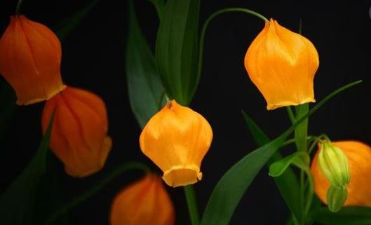 酷似燈籠的“宮燈百合”。外形嬌俏,玲瓏可愛,橙黃色的花鈴配以碧綠油亮的莖葉,十分招人喜愛,開花的時候就像掛在枝頭上的燈籠,和中國宮燈的形狀相似,故得名宮燈百合。