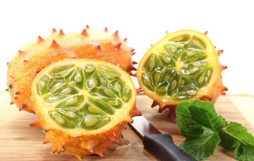 非洲角瓜又叫做奇瓦諾果,火參果,非洲蜜瓜等。原產自喀拉哈里沙漠地區,它能在干燥的氣候條件下生長。非洲角瓜的表皮為黃色帶刺,異常堅硬,但是肉質卻是細膩多籽,口味清甜,吃過以后嘴里會有輕微的余香。它的果皮中富含維生素C和植物纖維,也可食用。