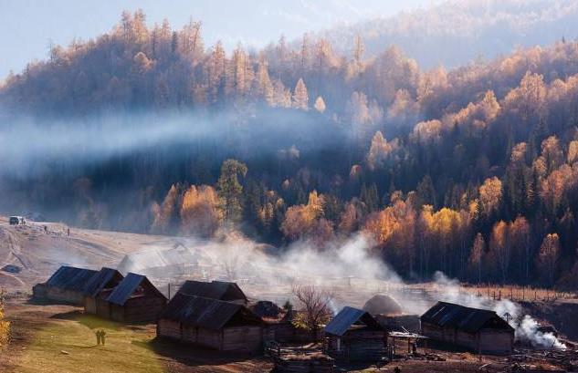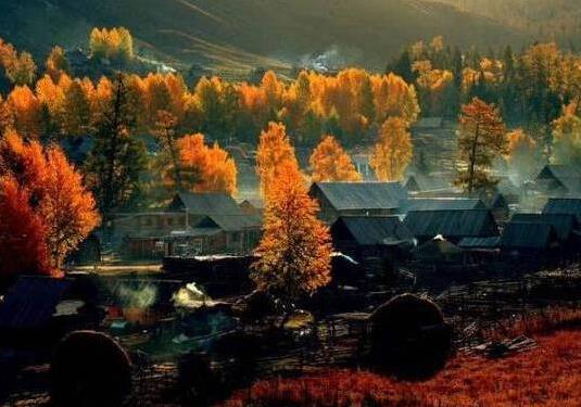 新疆布爾津縣的圖瓦村在夕照中,圖瓦村里那些帶有尖頂的、頗具瑞士風格的小木屋反射出一絲絲溫暖的金黃色光芒。小屋旁邊的松樹三三兩兩地散布著,全都高大筆直。村中還長有白樺樹,一棵一棵散落在松樹中間,因為枝干雪白,便很顯眼,再加上蓬勃的樹冠,似一把把大傘。在圖瓦村的背后,就是中俄邊境上的友誼峰,西伯利亞的風從友誼峰吹過來,隨著地勢降低,驟然變暖,便孕育出了這片濃密的山林。