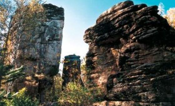 林海奇石國家森林公園位于距湯旺河區址8公里處,是由人文景觀和自然景觀構成的生態旅游新區和國家地質遺跡公園。景區可分為天然牧場、雪色松林、溪水濕地、民族風情、山水瀏覽、興安石林、秋色松林、花卉觀賞八大區域。區內奇峰驚石凌空突起,百年古樹蒼松參天聳立,奇樹怪石,形象逼真,寓義深廣,栩栩如生。南區是由黑龍江省原省長,黑龍江省書法家協會名譽主席陳雷同志于1993年視察時提寫景區主體標志石“小興安嶺石林”,著名的景點有“一線天”、“羅漢龜”、“雄峰”、“護山大將軍”等。西區是具有傳統故事色彩的“劍劈山”、“天犬巖”、“云靴頂”、“醉鰲石”組成的充滿神話故事的特異景觀。北區是以手持降魔桿,腰系驅鬼鞭的“鐘馗崖”及綠色深幽的“幽谷”和“蟠桃嶺”為主要內容反映民俗傳說習俗景觀。中區景觀以象形奇石為主,主要有“龍頭巖”、“龍鳳呈祥”、“-觀音”、“臥天!薄ⅰ芭d安靈芝”、“補天石”、“增壽龜”等。