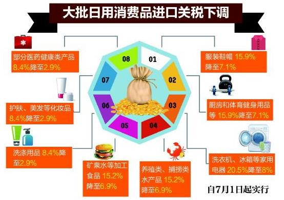 從今年7月1日起,將服裝鞋帽、廚房和體育健身用品等進口關稅平均稅率由15.9%降至7.1%;