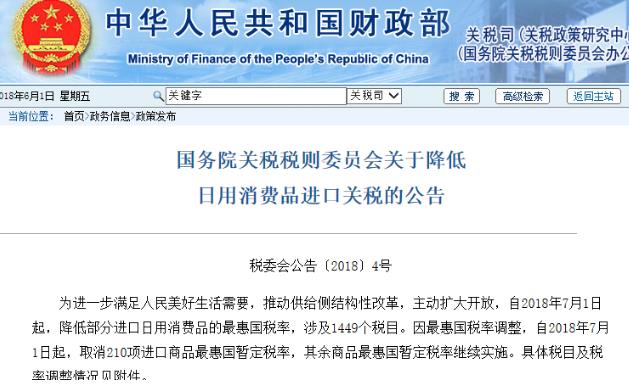 國務院關稅稅則委員會介紹,根據中共中央的決策部署,經國務院批準,自2018年7月1日起,降低部分日用消費品的最惠國稅率,涉及1449個稅目,平均稅率由15.7%降為6.9%,平均降幅55.9%。