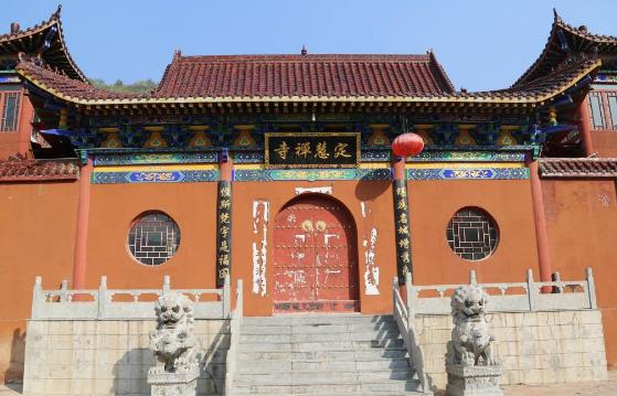 經修復的定慧禪寺,門額橫楹楷書“定慧禪寺”四個凸型金字,一對石獅端坐山門兩旁。進山門是金剛殿,中間端坐大肚彌勒佛,兩旁乃“開口便笑,笑古笑今凡事付之一笑;大肚能容,容天容地于人無所不容”名聯。金剛殿東西兩側,為新塑四大天王像,同彌勒佛相背、面南而立的是揚眉執杵的韋馱佛。庭院中間有高丈余的寶鼎一尊,穿過庭院,是金碧輝煌的大雄寶殿。殿高十多米,殿背正中新裝有“極樂指南”,高達兩米,使大殿更顯雍容壯觀。寶殿內新塑的高達一丈六尺如來佛,頷首端坐蓮花中央,身后光芒四射,千佛相繞,造型各異,姿態優美。