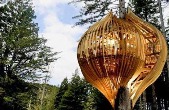 樹屋餐廳建在一棵高40米的巨大的紅杉樹上,外形像一只緩緩張開的大洋蔥,夜晚亮燈后依稀可見里面明亮的燈火和用餐的客人,有種朦朧的禪意。