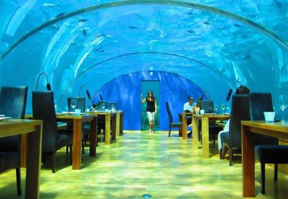 有幸在這里享受大餐的人們,可以透過玻璃觀賞外面的熱帶魚和珊瑚礁。當顏色鮮艷的成群珊瑚魚緊貼著四壁通透的餐廳游過時,人們都會情不自禁地發(fā)出贊嘆聲。
