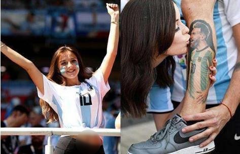 看到球衣就知道是阿根廷的球迷,這位球迷苗條的小蠻腰,面帶著微笑甚是可愛,而右圖中她親吻身旁男子腿部紋上去的梅西,表現出南美女人開放的性格。