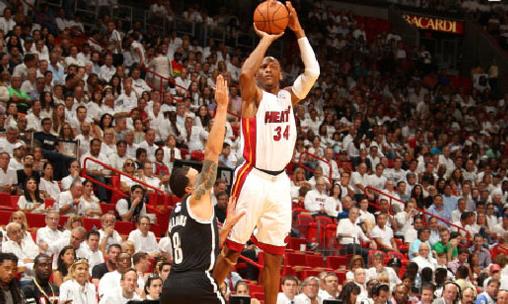 2013年總決賽第六場,雷-阿倫投中一記的足以載入史冊的三分。2013年6月19日,NBA總決賽第6場,當時馬刺距離總冠軍僅有一步之遙,詹姆斯投丟了扳平比分的三分球,波什搶到進攻籃板,傳給底線的雷-阿倫,阿倫撤步起跳命中,熱火將比賽拖入加時并最終取得第6場的勝利。