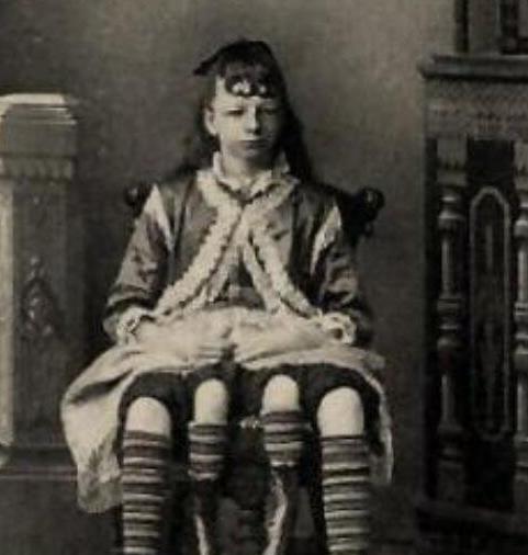 JosephineMyrtleCorbin在1868年的時(shí)候出身在田納西州的林肯鎮(zhèn)。她生出來的時(shí)候就是雙臀畸形,也就是說她腰部下來兩邊分別有一個(gè)獨(dú)立的骨盆。這就像FrankLentini的第三條腿那樣,多余的兩條腿本來是屬于另一個(gè)沒有正常分離的雙胞胎姐妹的。
