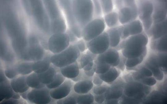 當(dāng)寒冷、充滿水汽的空氣從暴風(fēng)云上部快速下沉?xí)r,就會(huì)形成乳房云。濕冷空氣快速下降就會(huì)形成類似奶牛乳房的向下的凸起。當(dāng)崎嶇不平模樣的乳房云形成時(shí),通常會(huì)發(fā)生暴風(fēng)雨,并伴隨著雷暴現(xiàn)象。此名字來(lái)自拉丁語(yǔ)“乳房”。圖片顯示的是2004年6月美國(guó)內(nèi)布拉斯加州一座體育場(chǎng)上空的壯美景象。