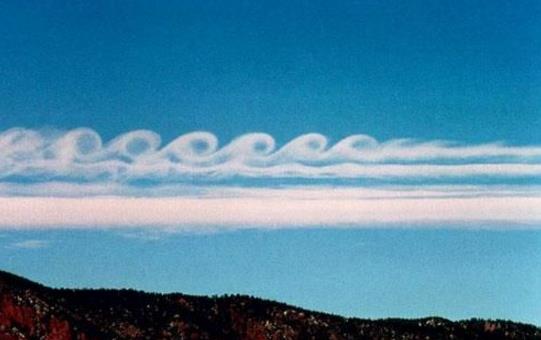 浪花云是自然界的一個(gè)奇觀,這種云層看上去非常像岸邊巨大的浪花,它非常罕見(jiàn),并且只持續(xù)1-2分鐘就會(huì)消失。這種云彩是由于開(kāi)爾文-赫姆霍茲原理形成的卷云。卷云是高云的一種,是對(duì)流層中最高的云,平均高度超過(guò)1800米,是很薄很纖細(xì)的云彩,能反射和誘捕熱量。這種云形成于下方是較冷的氣流,其上方是較暖的氣流,上方的氣流移動(dòng)速度快于下方,使該云層呈現(xiàn)波動(dòng)的形狀。如果在適當(dāng)?shù)娘L(fēng)速下,上方氣流的波動(dòng)將快于下方氣流的波動(dòng),從而形成類似海岸邊的浪花形狀。