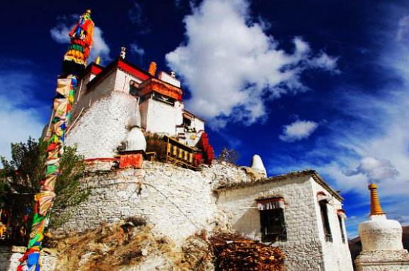 雍布拉康位于距澤當12公里的扎西次仁山上,海拔3700米。整個建筑雛形似碉堡,高聳于山頂。“雍布”的藏語意為“母鹿”,“拉”意為““后腿”,“康”意為“宮殿”,雍布拉康意為母鹿后腿上的宮殿。雍布拉康是西-史上的第一座宮殿,據史書記載始建于公元前2世紀,是雅礱部落的人們為第一代贊普聶赤贊布所修建的宮殿,距今已有2000多年的歷史。