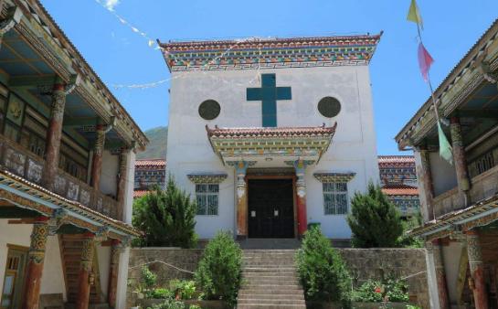 鹽井天主教堂是西藏唯一的天主教堂,位于芒康縣納西鄉上鹽井村,國道214線旁,占地面積6000多平方米,是中西文化交流融合的典范。天主教1865年傳到鹽井,至今已有近一個半世紀了,自1865年至1949年歷經17位外藉本堂神父。首次打開這種局面來到鹽井傳教的有兩位神父(鄧德亮神父和比神父)。兩位傳教士經過長途跋涉,翻山越嶺從之南貢山的朋卡來到現在鹽井的根拉村,并在根拉村住了一段時間,當時群眾中已有信教的人,1865年從貢格-手中買下了上鹽井的這塊地皮,并蓋起了教堂,有十五間的住宿。