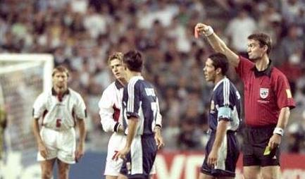 九八年世界杯,貝克漢姆“紅牌門”震驚了世界足壇,也讓這位“場上第一高度”的高佬一夜間變得盡人皆知。顯然這名很能代表北歐大漢形象的丹麥第一哨物理水平不怎么樣,小貝倒地后小腿的小幅度擺動也能把個頭一米八以上的西蒙尼像棒槌一樣撂倒?顯然甚不合理,更夸張的是尼爾森直接掏出了紅牌將貝帥哥罰回了更衣室提前沐浴。