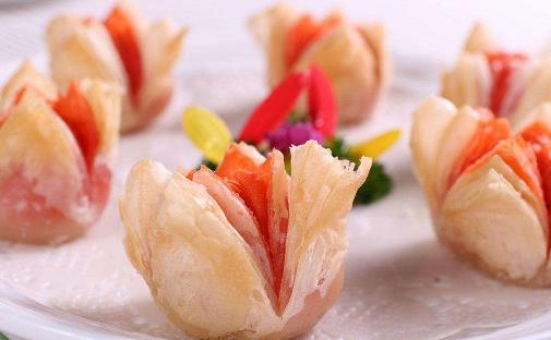 荷花酥屬于“宴席”常用的花式中點,源自明清時期,后來被供為宮廷點心。酥皮點心是中式點心中的一大類,分明酥和暗酥。明酥從表面可以看到清晰的層次,暗酥則看不到,荷花酥就屬于明酥的一種,吃起來脆酥香甜。荷花酥還曾名列滿漢全席萬壽宴的菜單。