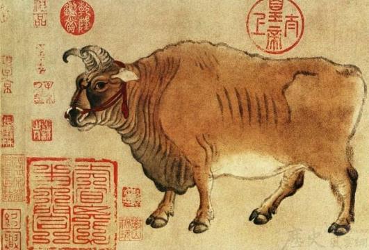 這幅《五牛圖》,是韓滉最為傳神的一幅。麻紙本,縱20.8厘米,橫139.8厘米,無(wú)款印。5頭健碩的老黃牛,在這位當(dāng)朝宰相筆下被“人格化”了,傳達(dá)出注重實(shí)際、任勞任怨的精神信息。
