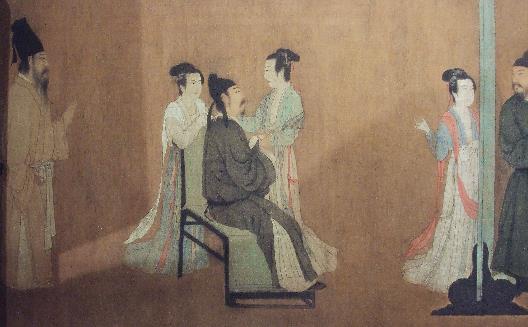 《韓熙載夜宴圖》,絹本縱28.7厘米,橫335厘米。是五代大畫(huà)家顧閎中所作,以連環(huán)長(zhǎng)卷的方式描摹了南唐巨宦韓熙載家開(kāi)宴行樂(lè)的場(chǎng)景。用筆細(xì)潤(rùn)圓勁,設(shè)色濃麗,人物形象清俊、娟秀,栩栩如生而名聞中外。