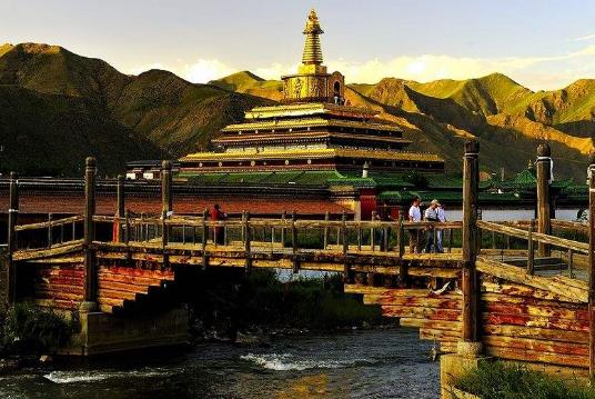 位于夏河縣城西1公里處,大夏河將龍山、鳳山之間沖積成一塊盆地、藏族人民稱之為聚寶盆、拉卜楞寺就坐落在聚寶盆上。它與西藏的哲蚌寺、色拉寺、甘丹寺、扎什倫布寺、青海的塔爾寺合稱我國-教格魯派(黃教)六大寺院。拉卜楞為藏語“拉章”的轉音,意為佛宮所在的地方。寺廟始建于清康熙四十八年(1709年),有18座金碧輝煌的佛殿,萬余間僧舍,鱗次櫛比,金瓦紅墻,氣勢非凡。其中,以六大扎倉最為著名。扎倉,藏語意為學院。