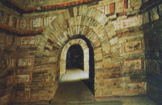 魏晉磚壁畫墓位于嘉峪關市區東約18公里的新城鎮,在近13平方公里的地域內分布著魏晉時期的古墓葬一千余座,素有“地下畫廊”之稱。1972年~1979年期間,先后發掘了18座墓葬,其中9座為畫像磚墓,9座為素磚墓。其中五號墓于1973年5月整體搬遷到甘肅省博物館。目前正式對外開放2座。新城墓葬建筑形制獨特,墓葬由墓道、墓門、門樓、前室、中室、后室、甬道、耳室、壁龕等組成。建筑用磚分為印紋方形磚、長方形磚、雕刻磚、畫像磚等。