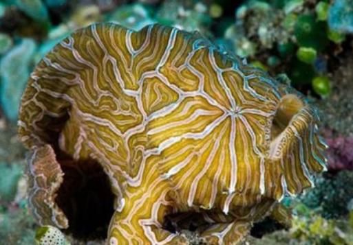 迷幻躄魚,是一種黃褐色或桃紅色的躄魚,因其全身遍布迷幻般的粉色和白色條紋而得名。這種魚生活在印度尼西亞安汶島和巴厘島附近的水域中。它的奇特之處在于它不僅僅善于隱藏,還可以通過噴射推動力來逃避危險。迷幻躄魚的皮膚呈膠狀,顯現肥胖、肉質厚而松軟,它的皮膚上覆蓋著白色條紋,這些白色條紋是從眼睛呈放射狀向身體蔓延。