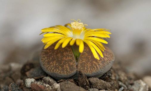 生石花是石竹目,番杏科生石花屬全屬植物的總稱,約有40種。多年生肉質草本,幾乎無莖;球狀葉色彩多變,葉表皮較硬,色彩多變,頂部具有深色樹枝狀凹陷紋路,或花紋斑點,稱作“視窗”。植物頂部有一裂縫,裂縫中開花,花單生,雛菊狀,花莖2-3厘米,花白或黃色,花期盛夏至中秋。原產南部非洲,喜溫暖干燥和陽光充足環境,怕低溫,忌強光暴曬,該屬植物生長適溫為10-30℃,冬季溫度不低于12℃,可短暫耐受4-5℃的低溫。生石花形態奇特,花色艷麗,使得許多愛好者專門收集栽培,具有很高的觀賞價值。
