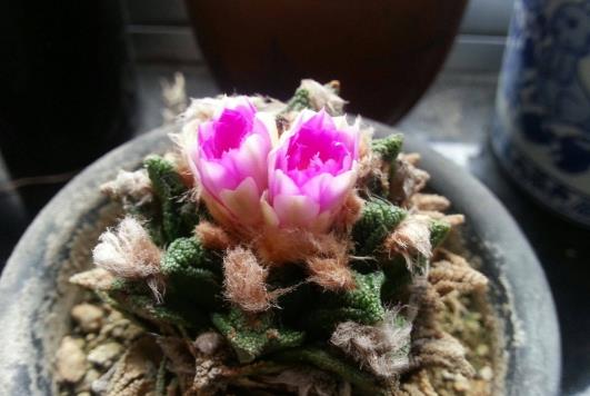 龜甲牡丹為仙人掌科巖牡丹屬植物,是美麗而奇特的物種,主要分布在美國德克薩斯和墨西哥。龜甲牡丹,仙人掌科植物,它外形奇特,花多而嬌艷。球狀植株單生或叢生,呈墊狀生長,單個球體直徑10厘米至15厘米,頂部扁平,被有濃厚的白色或黃白色絨毛。表皮具厚實而堅硬的三角形疣突,疣突表面上灰綠色,至褐綠色,皺裂成不規則的溝,正中間一條縱溝一直伸到疣的腋部,并具短綿毛;斏姞睿奂t色,長3.5厘米至4厘米,非常艷麗奪目,且常數朵同時開放。
