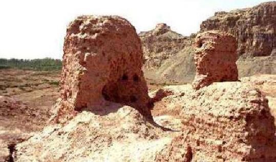 駱駝圈子駱駝圈子位于51團15連北約10公里。時代:唐-宋。該遺址為一處基本方形結構遺址,長寬60米,面積3600平米。據當地人講,此地早些年有駱駝隊在此駐扎過,因呼“駱駝圈子”,至于遺址的年代據說很早,連他們也不清楚。遺址現只剩四周一段段殘墻,高約3米,厚1米。在該遺址中和附近發現一些陶片,有紅陶、黑陶、灰陶、夾沙陶等,陶質特征與瓊梯木附近沙漠中發現陶片相似。