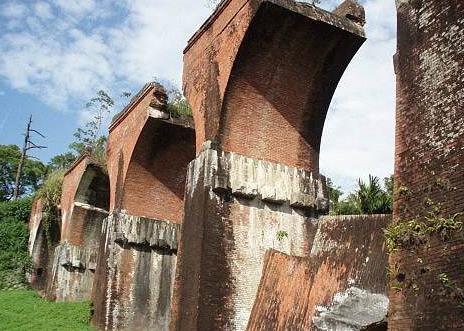 魚藤坪斷橋又名龍騰斷橋,位于苗栗縣三義鄉(xiāng)龍騰村舊山縣鐵路魚藤坪鐵橋上游80公尺處,是臺灣1907年所興建完成的磚造橋墩橋梁。這座曾經(jīng)被譽(yù)為“臺灣鐵路藝術(shù)極品”的磚拱鐵路橋,歷經(jīng)1935年、1999年兩次臺灣中部大地震后,留下了斷橋殘拱傷痕,深具歷史意義及建筑技術(shù)紀(jì)念意義。大地震過后,魚藤坪橋已不堪使用,且橋體南北兩側(cè)均為急彎彎道,因此臺灣總督府交通局鐵道部臺中線震災(zāi)復(fù)興事務(wù)所放棄改建原橋,而在原橋西側(cè)另行新建第2代魚藤坪橋,并于1938年竣工,以取代原來的第1代魚藤坪橋。