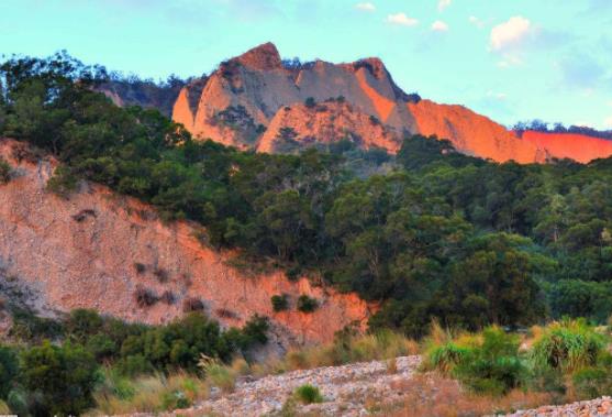 火炎山位于三義鄉(xiāng)和苑里鎮(zhèn)的交界,南臨大安溪。全山因土質(zhì)松散,長久以來經(jīng)風(fēng)吹雨沖,陡峭的巖壁逐漸流失,當(dāng)陽光照射在山峰上,遠(yuǎn)望如絢爛的火焰,氣勢萬鈞。火炎山以光禿挺撥的景觀著名,山上馬尾松林是國內(nèi)稀有的特殊林相,由農(nóng)委會于1986年列為自然保留區(qū),火炎山自然保留區(qū)在地質(zhì)上屬第四紀(jì)的臺地堆積,是劇烈造山運(yùn)動的產(chǎn)物,其巖層主要由厚層礫石組成,間夾薄層砂巖,膠結(jié)力弱;由於風(fēng)化、侵蝕作用不斷,地形切割的支離破碎,加上雨水的沖蝕,切割面往往又極為平整,因此在外形上形成尖銳山峰的組合及深谷里滿布軟卵石的景象。