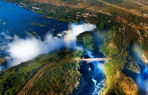 維多利亞瀑布,又稱莫西奧圖尼亞瀑布,位于非洲贊比西河中游,贊比亞與津巴布韋接壤處。寬1700多米(5,500多英尺),最高處108米(355英尺),為世界著名瀑布奇觀之一。歐洲探險家,戴維·利文斯敦1855年在旅途中發現它,并以英國女王的名字為其命名。維多利亞瀑布1989年被列入《世界遺產名錄》。維多利亞瀑布的寬度和高度比尼亞加拉瀑布大一倍。平均流量約935m3/s(3.3萬立方英尺/秒)。廣闊的贊比西河在流抵瀑布之前,舒緩地流動在寬淺的玄武巖河床上,然後突然從約50米(150英尺)的陡崖上跌入深邃的峽谷。主瀑布被河間巖島分割成數股,浪花濺起達300米(1000英尺),遠自65公里(40英里)之外便可見到。每逢新月升起,水霧中映出光彩奪目的月虹,景色十分迷人。瀑布聲如雷鳴,當地卡洛洛-洛齊(Kalolo-Lozi)族居民稱之為“莫西奧圖尼亞”(Mosi-oa-tunya),意即“霹靂之霧”。據考證,遠在公元90年即有少數農業人口在贊比西河兩岸定居。多數原住民則在距瀑布半徑128公里(80英里)范圍內以漁獵為生。