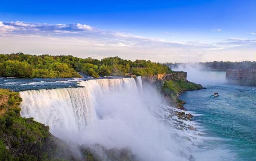 尼亞加拉瀑布(Niagara Falls)位于加拿大安大略省和美國紐約州的交界處,瀑布源頭為尼亞加拉河,主瀑布位于加拿大境內,是瀑布的最佳觀賞地;在美國境內瀑布由月亮島隔開,觀賞的是瀑布側面。同時,該瀑布也是世界第一大跨國瀑布。尼亞加拉河的水流沖下懸崖至下游重新匯合,在不足2公里長的河段里以每小時35.4公里的速度跌蕩而下15.8米的落差,演繹出世界上最狂野的漩渦急流,經過左岸加拿大的昆斯頓、右岸美國的利維斯頓,沖過“魔鬼洞急流”,沿著最后的“利維斯頓支流峽谷”由西向東進入安大略湖。尼亞加拉瀑布與伊瓜蘇瀑布、維多利亞瀑布并稱為世界三大跨國瀑布。