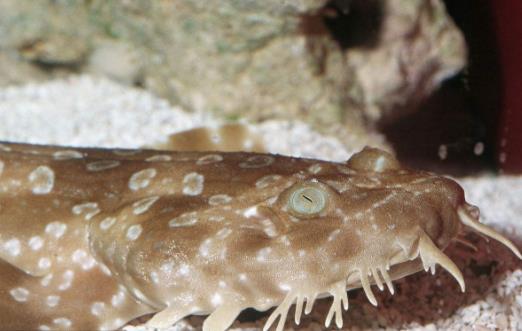 須鯊(carpet shark)是須鯊目須鯊科一類鯊魚的總稱,在生物學分類上歸于軟骨魚綱、板鰓亞綱、鯊形總目、須鯊目、須鯊科。須鯊長相怪異,又被稱為“毯鯊”,體長約1.2米至3米,具有十分出色的偽裝能力。長有斑點的皮膚加上具有倒鉤的觸須,使得須鯊能夠完全融入海底環境,精心埋伏等待獵物。當有“不明真相”的小魚、螃蟹、章魚甚至另一種鯊魚游過來的時候,須鯊迅速攻擊,張開大嘴將獵物吞沒。