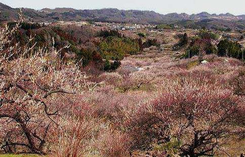 梅花和櫻花同屬薔薇科李屬植物,二者與日本國民的生活密不可分,并對(duì)日本園林綠化發(fā)揮著巨大作用,春天的賞櫻和賞梅是日本最熱鬧的活動(dòng)之一。在日本,群馬縣梅樹的產(chǎn)量僅次于和歌山縣,位列全國第二,在日本東部名列第一,秋間梅林就是其中最大規(guī)模的梅林之一。秋間梅林是指位于秋間川上游穿過安中市丘陵地帶的梅樹林,總面積50萬平方米,擁有35000多棵梅樹。在二月和三月,梅樹的葉子還沒來得及長出來,但是已經(jīng)抽出幾朵五瓣花來,花朵的顏色大多是白色,也有紅色和淺紅色的。