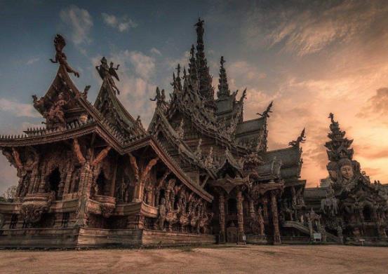 真理寺坐落于泰國芭堤雅的海邊,與其說它是一個寺廟,不是說是一件宗教藝術作品,因為是一個完全由木頭建造而成的建筑,并且矗立有佛教和印度教的雕塑,栩栩如生,讓人感嘆不已。由于位于海邊,真理寺遠遠望去就像是一艘停泊在海岸的帆船,但比帆船還要美麗壯觀。真理寺是一座融合宗教文化和藝術的特別建筑物,是由泰國富商瓦里亞潘(Lek Viriyaphant)出資興建的,于1981年開始建造,雖然瓦里亞潘去世了,但是建造工程一直在繼續,預計于2025年完工。