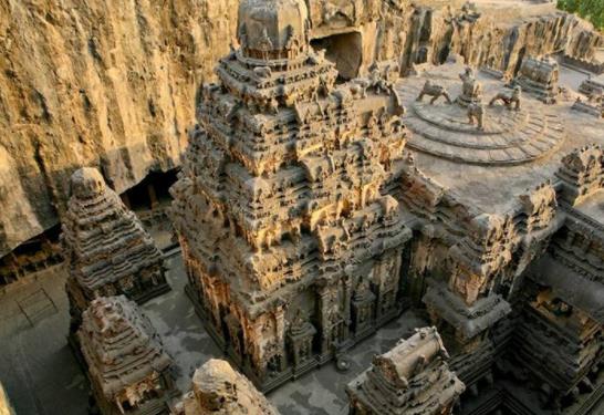 埃洛拉石窟群位于馬哈拉施特拉邦的奧蘭加巴德,建于公元4世紀中葉至11世紀,是古印度佛教、印度教和耆那教藝術的杰作。埃洛拉石窟群是世界上最好的寺廟石雕建筑的典范,也是印度規模最大的石窟寺院群,他們屹立在高高的陡峭巖壁上,34座洞穴廟宇被開鑿出來,一座挨一座,延伸2000多米。這些保存完好,排列有序的遺跡可追溯到公元600至1000年,古印度文明的再度復興時期,不僅藝術造型獨特,技術水準高超,而且作為佛教、婆羅門教和耆那教的圣殿,它們是古代印度容忍、寬恕特性的精神所現。
