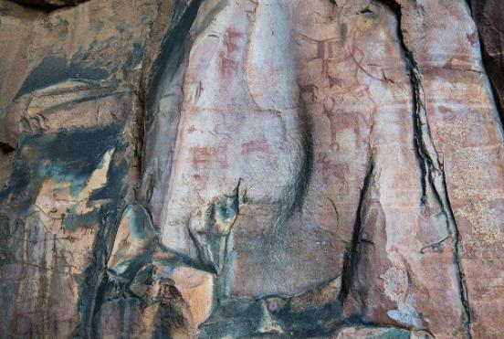 溫迪亞山脈的比莫貝卡特石窟位于印度高原心臟地區南部邊緣的溫迪亞山脈丘陵地帶。在相對密集的森林之上是大量的沙石巖,有五組天然石窟,里面巖畫的歷史從中石器時代一直延續到文明歷史時代。21個毗鄰石窟遺址的村莊居民的文化傳統,與石窟巖畫中所描繪的內容有極大的相似之處。比莫貝卡特石窟擁有大量精美的巖畫,反映了人與自然之間的長期相互作用,從石窟的巖畫藝術和石窟周圍村莊這種巖畫藝術傳統的遺跡中可以看出,比莫貝卡特石窟是與以狩獵和采集為主的社會經濟密切聯系的。