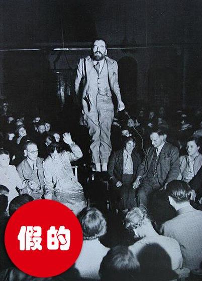 這張照片看起來讓人很是不可思議,然而這張照片真的是偽造的。它描繪了二十世紀初的靈性主義者科林埃文斯。在其中一個會議上,埃文斯在黑暗中表演,拍攝了這張照片。看起來他應該是懸浮的。但事實上,當閃光燈照亮他的身影時,他才跳了起來。仔細看看,他袖子上的繩子給了他混淆大眾的機會,埃文斯只是在恰當的時刻(跳躍時期)按下閃光釋放按鈕。
