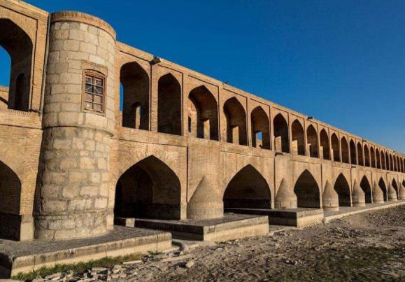 33孔橋坐落于伊斯法罕,為伊朗七大橋梁之一,同時也是薩非王朝大橋設(shè)計(jì)的杰出代表,于1599年開始建造,1602年完工,因有33個孔,而被命名為33孔橋。33孔橋橫跨宰因達(dá)河(Zayandeh River),是一個每到伊朗的游客必游的景點(diǎn)。橋分為上下兩層,長297米,寬13米,共33孔,在建成之初,這座橋既承擔(dān)了橋梁的功能,同時又是大壩,尤其在旱季將珍貴的水源攔截下來。33孔橋的橋拱呈伊斯蘭建筑典型的桃形,橋的中間可以通行車馬,現(xiàn)在只是用作步行橋。