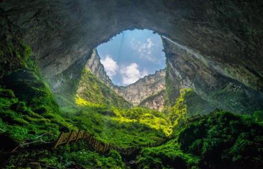 樂業天坑群位于中國廣西樂業縣,占地約20平方公里。初步已發現有大石圩、白洞、風巖洞、穿洞等20多個天坑。“天坑”四周皆被刀削似的懸崖絕壁所圍,形成一個巨大的豎井,底部是人類從未涉足過的幾十萬平方米的原始森林,并有地下河相通。