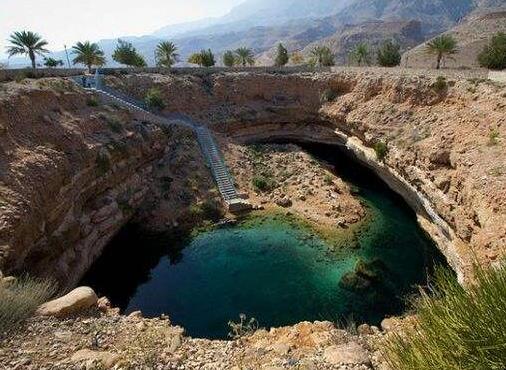 坐落在阿曼首都的一個公園。美麗的綠色水域深約65英尺(20 米),寬約131英尺(40米)。水底隧道連接著深洞與海洋,這也許是它的湛藍色調令人著迷的原因吧。Bimmah天坑已經成為一個倍受青睞的旅游勝地。游客們十分享受浸泡在水中觀賞魚躍的那份愜意,還有些人干脆跳入池中,激起水花四濺。盡管天坑是因石灰巖侵蝕與沉陷形成,然而當地神話傳說卻十分奇特——它是流星隕落而成的。