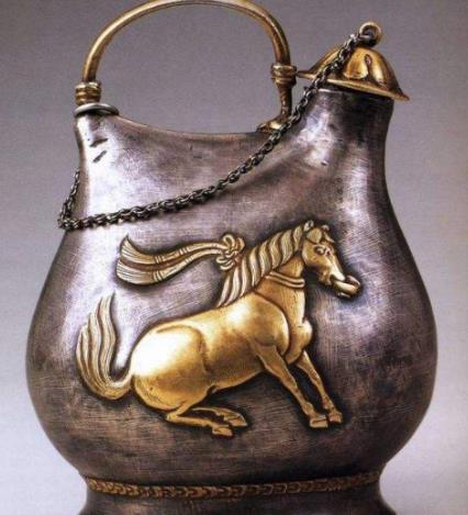 鎏金舞馬銜杯紋銀壺為唐朝的文物,1970年窖藏出土于陜西省西安市南郊何家村,高14.8厘米,口徑2.3厘米。現收藏于陜西歷史博物館。這件文物的壺腹兩側用模具沖壓舞馬圖,特別的精美。這件文物是在1970年的時候出土于陜西省西安市南郊何家村。
