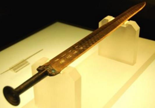 越王勾踐劍(Sword of Goujian),春秋晚期越國青銅器,國家一級文物,1965年冬天出土于湖北省荊州市江陵縣望山楚墓群中。因劍身上被鍍上了一層含鉻的金屬而千年不銹。經無損科學檢測,其主要合金成分為銅、錫、鉛、鐵、硫等。花紋處含硫高,因硫化銅可防銹。劍通高55.7厘米,寬4.6厘米,柄長8.4厘米,重875克,極其鋒利。刻有“鉞王鳩淺,自乍用鐱”八字。
