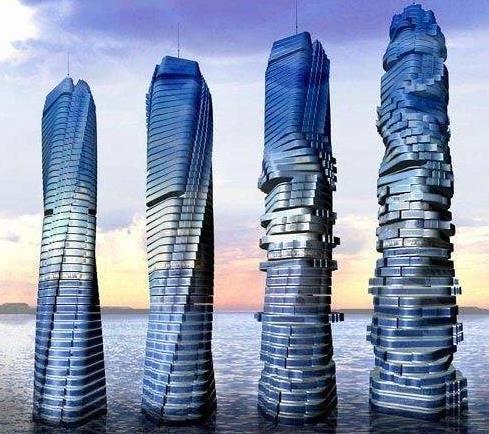 最初的設(shè)計方案是建造七大洲,但是迪拜人發(fā)現(xiàn)如此大塊的島嶼不會有人買得起,因此將七大洲方案改為由300個人工小島按照世界各大洲形狀組成的人工群島。讓一座摩天大樓在空中旋轉(zhuǎn)“跳舞”,聽上去像是科幻小說。可迪拜就建設(shè)了這樣一個建筑,它是世界首個風力發(fā)電的旋轉(zhuǎn)摩天大樓。