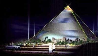 顯然源于埃及金字塔所帶來的靈感,又不失現(xiàn)代化的風格。這個金字塔充分利用空間,并將于兩旁兩個較小的金字塔房屋作為開發(fā)商的辦事處和商業(yè)空間,使之整體成為一座龐大的主題公園。