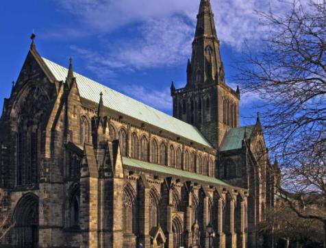 格拉斯哥大教堂是西元1136年為了奉獻給格拉斯哥的守護神St.Mungo而建,歷經三百年完工,是宗教改革前的哥德式建筑物的典范,亦是英國唯一改革后能夠保存下來的蘇格蘭大教堂。目前大部分的建筑都是建自15世紀,只有西塔在-中遭到毀壞。在15世紀晚期,大教堂中間增加了一條石制的祭壇圍屏,把教堂的間隔分成兩部份。圍屏旁邊有7對石像裝飾,用來代表“-”。最有趣的地方是有條樓梯可通往矮教堂。密布的柱子營造出一種氣勢,包圍著圣芒戈的墓碑。愛德華一世在1301年曾到過這個神殿3次。